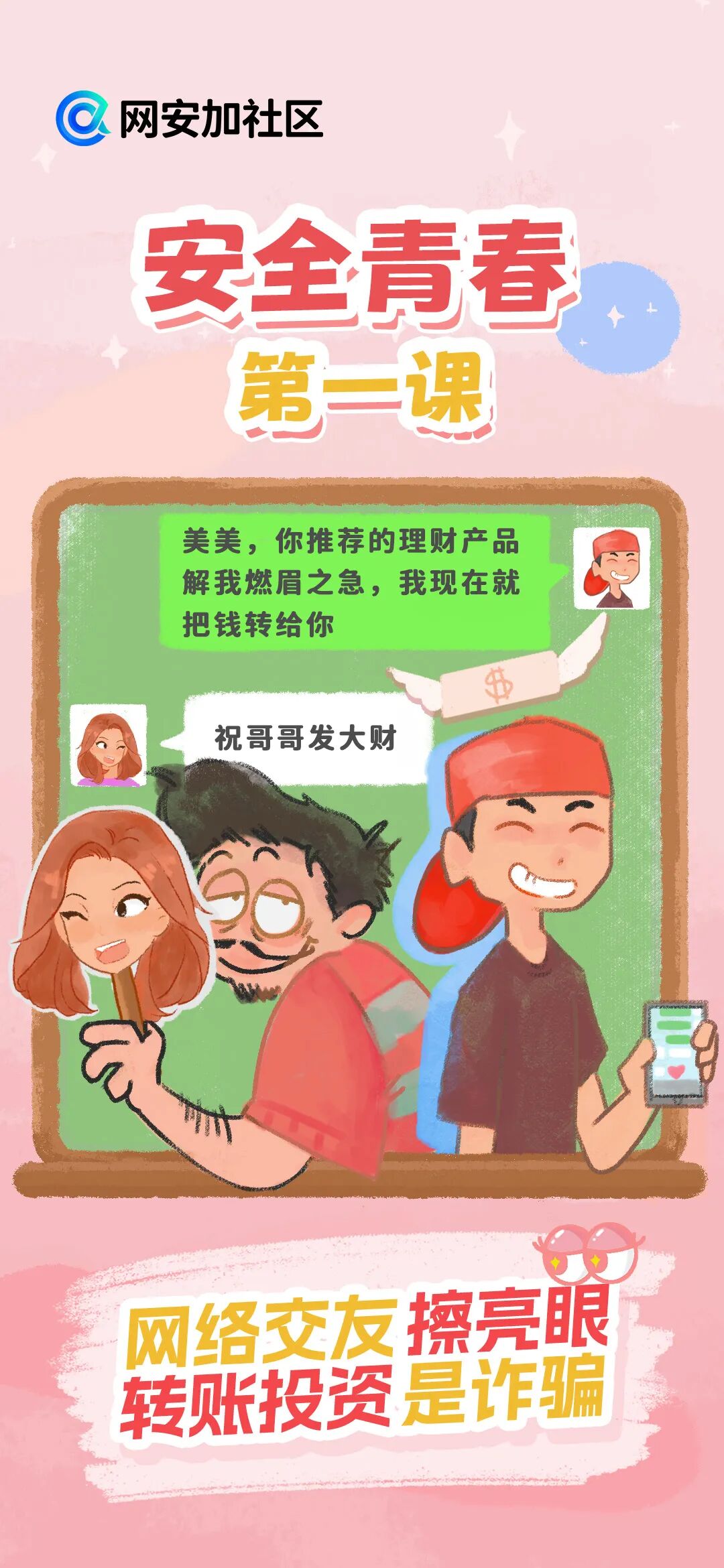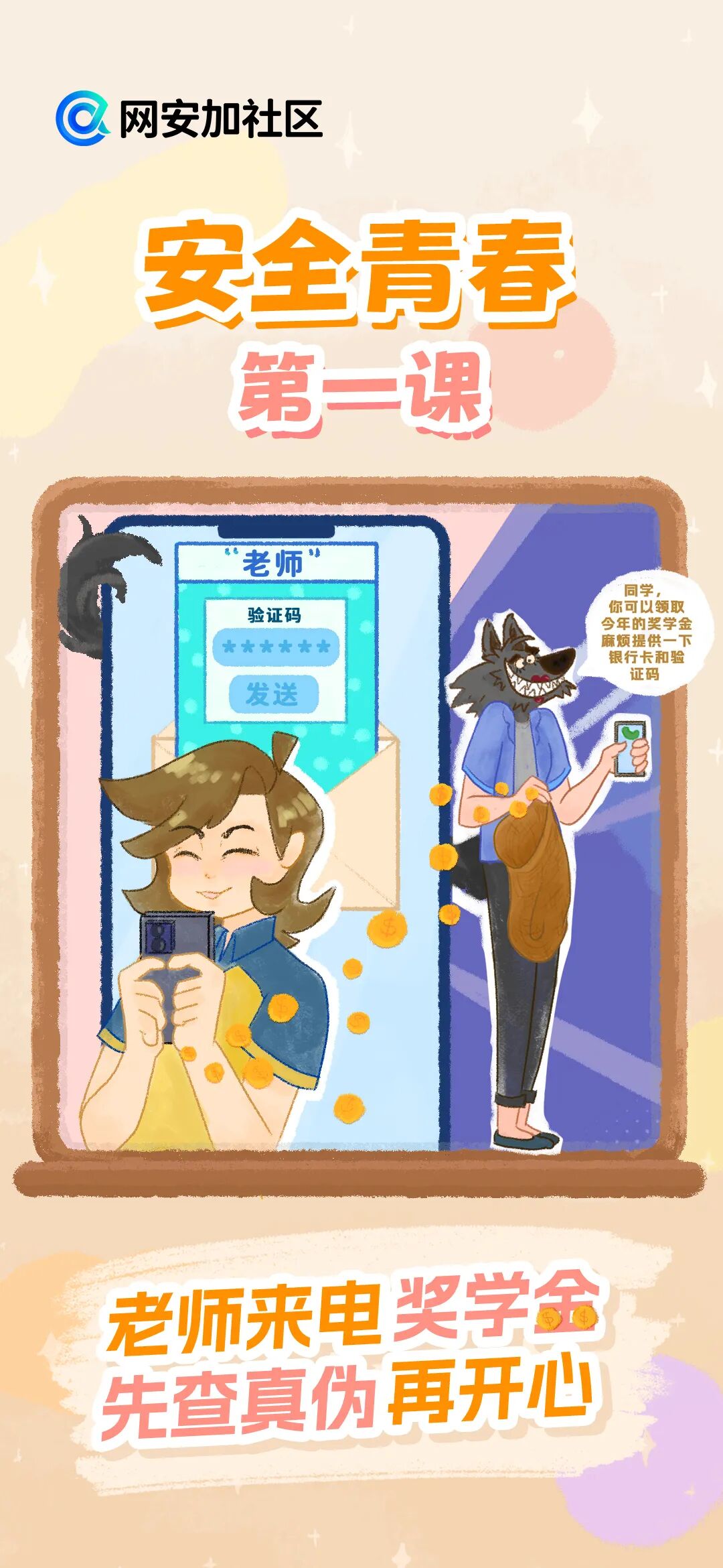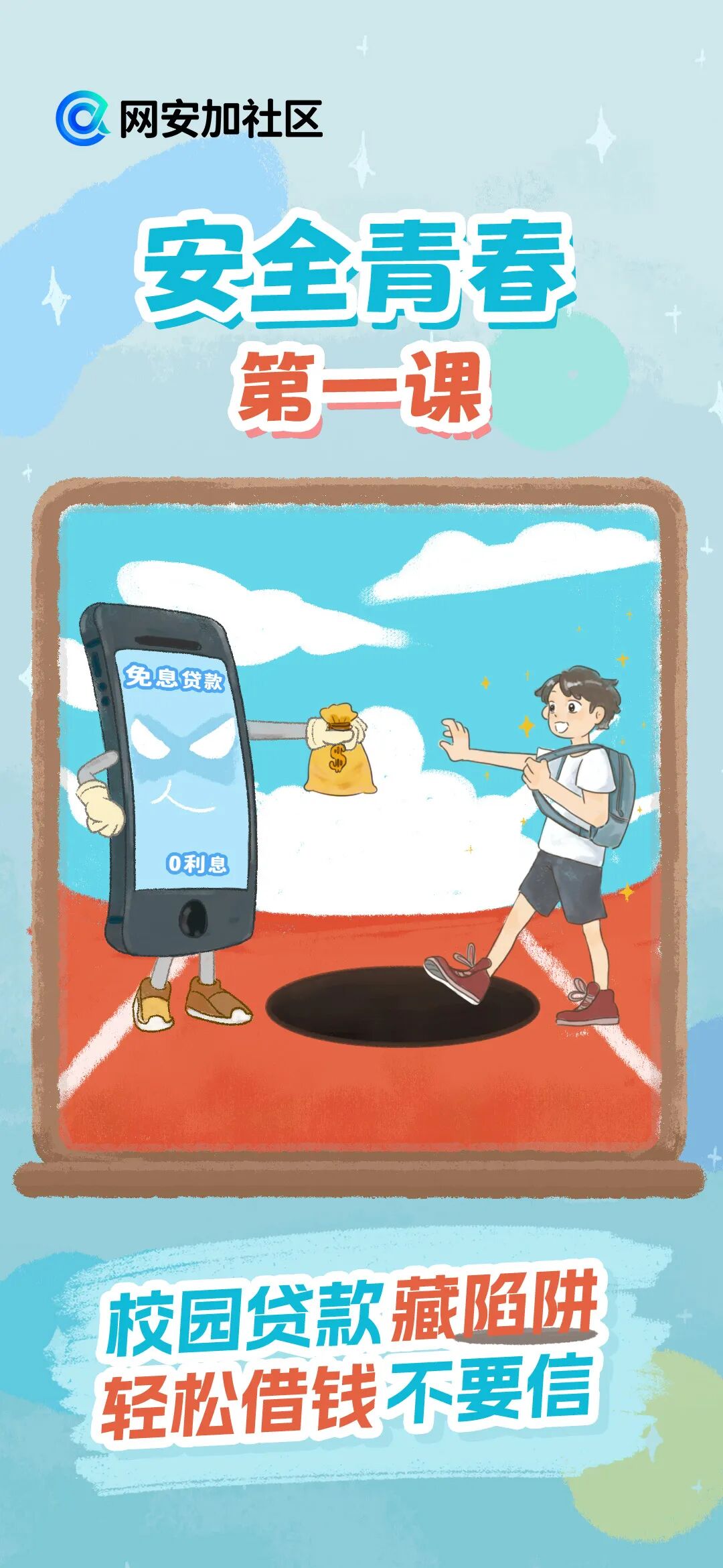 随着网络的日益普及,网络已成为我们生活学习中不可或缺的一部分。值此网络安全宣传周之际,网安加社区策划了“安全青春第一课”校园日主题宣传,带同学们认识并防范校园里常见的网络诈骗陷阱,学习网络安全知识,增强网络安全意识,共同为青春筑起一道坚实的防护墙。
