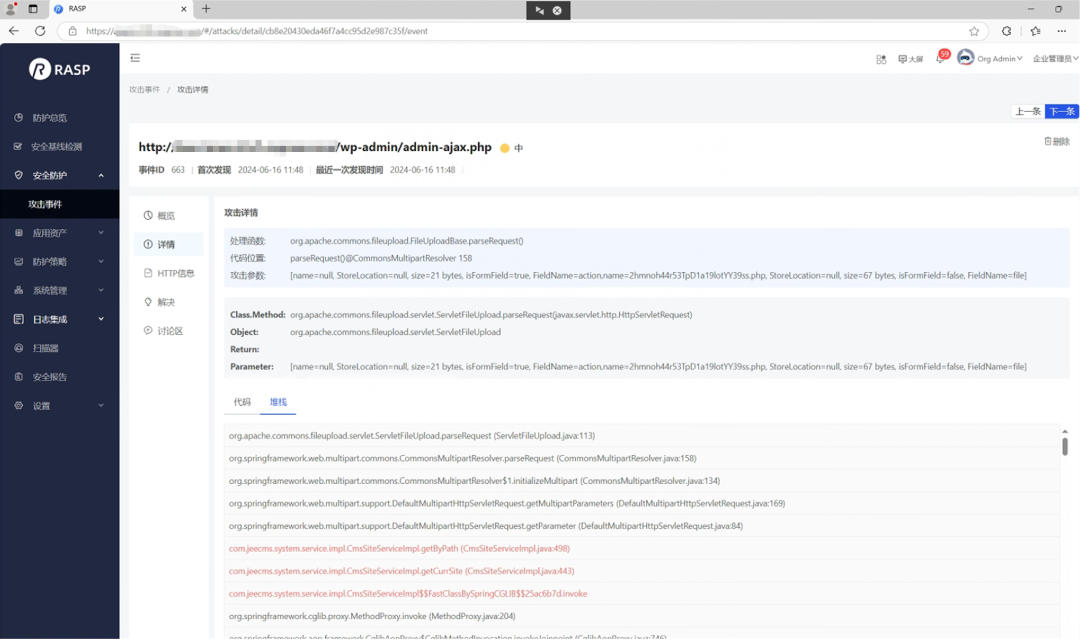 2. 行为识别: RASP通过其内置的检测逻辑,识别出请求中的参数符合远程代码执行攻击的特征。