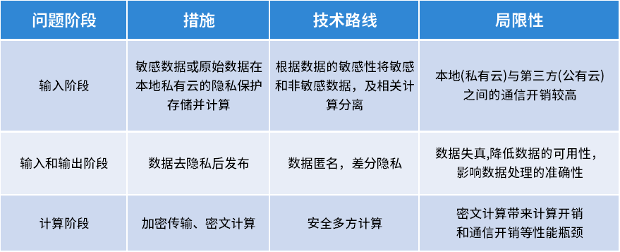 然而,当数据敏感等级相对较低时,可以考虑将其存放在公有云上以降低成本。但这种数据分开存放的策略可能导致通信开销增加。此外,在输入和输出阶段,如果云服务提供商不可信或存在安全风险,明文数据的传输和存储可能面临被攻击和泄露的风险。