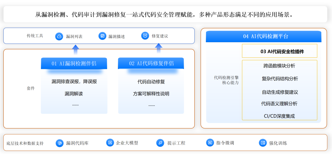 通过新的架构训练软件缺陷检测和修复一体化模型,具备参数规模适中、高准确率、低误报、自动修复、高效率等特点,在公开数据集上取得了较好的效果。