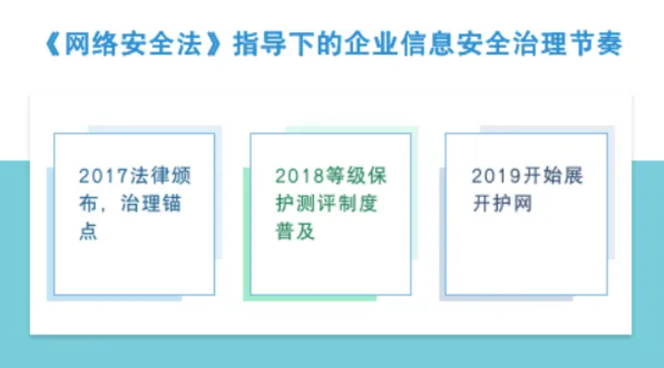 当时预测的网络安全建设节奏应该是,立法及普法、扩大行业监管、提高演练频率,当初的预测或者说今天的治理历程如下图: