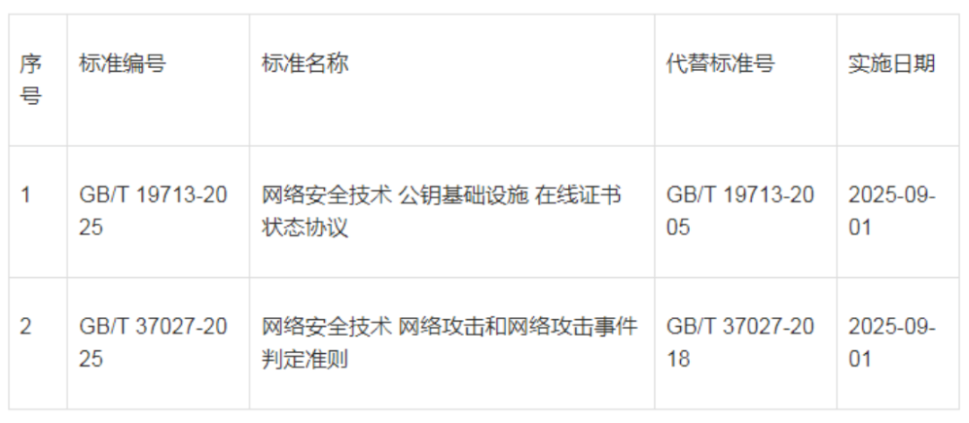 3月17日,根据2025年2月28日国家市场监督管理总局、国家标准化管理委员会发布的中华人民共和国国家标准公告(2025年第4号),全国网络安全标准化技术委员会归口的2项国家标准正式发布。具体清单如下: